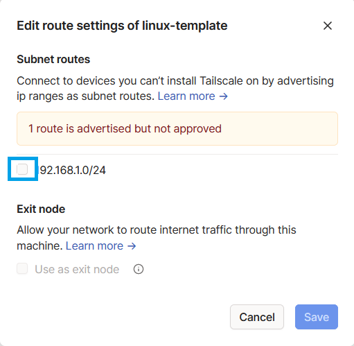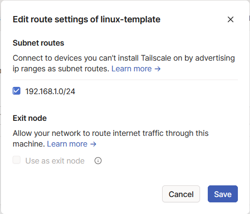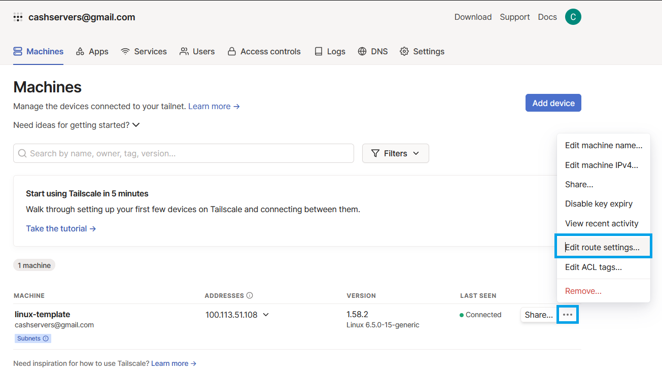 Now that your device is connected there is just a couple more things needing to be buttoned up on. Head to your tailscale dashboard and you will see your vpn server will be listed. Click the 3 buttons to the right and click "Edit Route Settings"