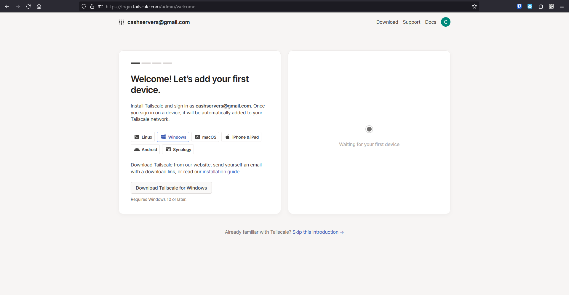 Once signed in, the dashboard will say "Waiting for your first device"