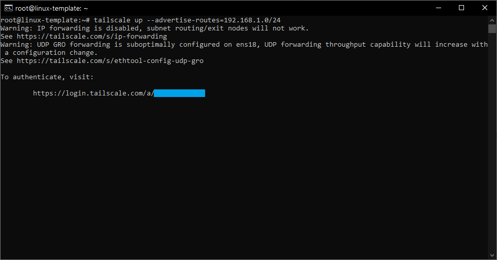 Step 5. Once Tailscale is finished installing, You'll need to activate it with the following command. There is also a "Advertise Route" command at the end which allows you to be able to connect to everything within the network. Once finished, You should see a connection link at the bottom. Copy and paste that URL into your browser of choice